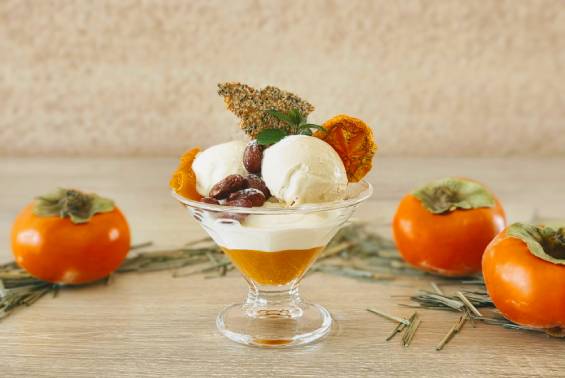 冬に味わう、特別なパフェ。濃厚なあんぽ柿ピュレとクリームチーズを重ねほうじ茶アイスとバニラアイスが冷たい中にもほっとする余韻を残します。